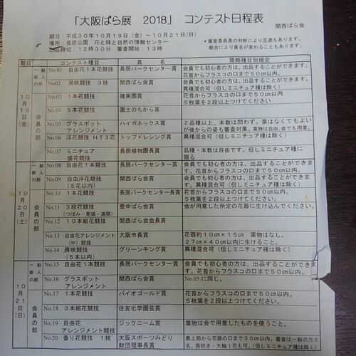 当会のばら展のお知らせです。今日から日曜日までです。時間のある方はお越し下さい。一般・新人の部で飛び入り参加OKですので、バラが咲いていればお持ち下さい。